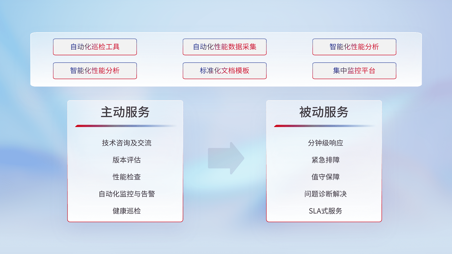 智能化工具和标准化文档,,,保障服务质量,,,,提供主动服务(包含技术咨询、、、、版本评估、、、、性能检查、、、、自动化监控与告警、、、、健康巡检)和被动服务包含(分钟级响应、、、紧急排障、、值守保障、、问题诊断解决、、SLA服务)。。。