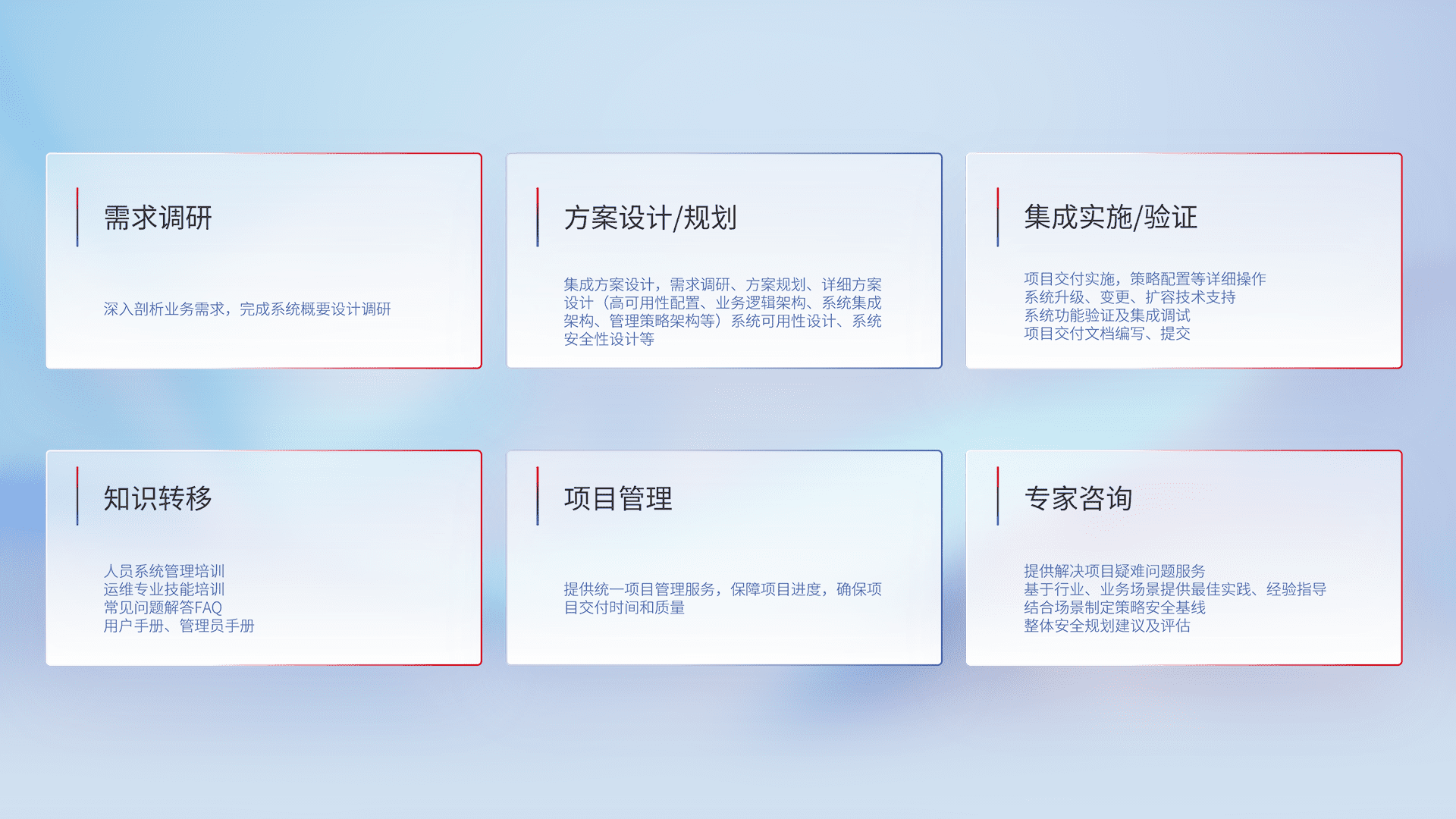 针对客户行业特性,,将宏观的安全战略和需求,,,通过专业的交付服务,,实现项目落地,,,为客户提供标准规范的集成交付服务。。。。